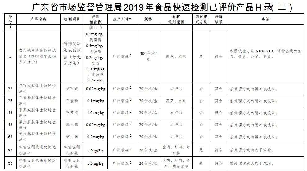 由廣東省市場(chǎng)監(jiān)督管理局組織廣東省食品檢驗(yàn)所開展的快速檢測(cè)產(chǎn)品現(xiàn)場(chǎng)驗(yàn)證活動(dòng),于近日公布結(jié)果。廣州瑞森生物科技股份有限公司參與的克百威快速檢測(cè)卡、甲萘威快速檢測(cè)卡以啶蟲脒快速檢測(cè)卡等11種快檢產(chǎn)品通過現(xiàn)場(chǎng)驗(yàn)證。