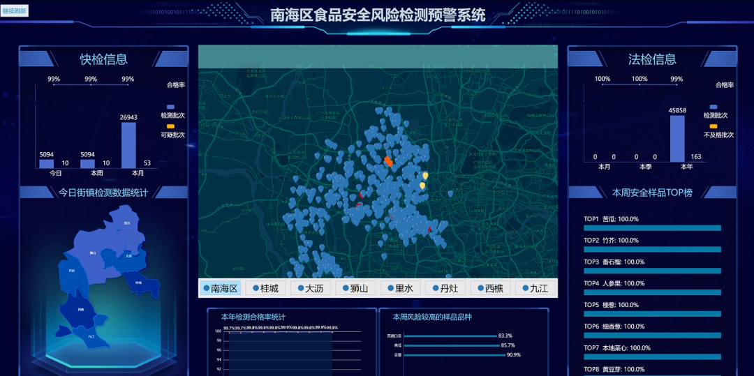 所有檢測(cè)信息均會(huì)實(shí)時(shí)上傳食品安全風(fēng)險(xiǎn)檢測(cè)預(yù)警系統(tǒng),系統(tǒng)設(shè)置“今日鎮(zhèn)街檢測(cè)數(shù)據(jù)統(tǒng)計(jì)”“本年檢測(cè)合格率”“本周風(fēng)險(xiǎn)較高的樣品品種”“本周安全用品TOP”“快檢信息”“法檢信息”六大模塊內(nèi)容,對(duì)收集到的數(shù)據(jù)進(jìn)行分析,形成“南海區(qū)食品快檢數(shù)據(jù)”地圖。