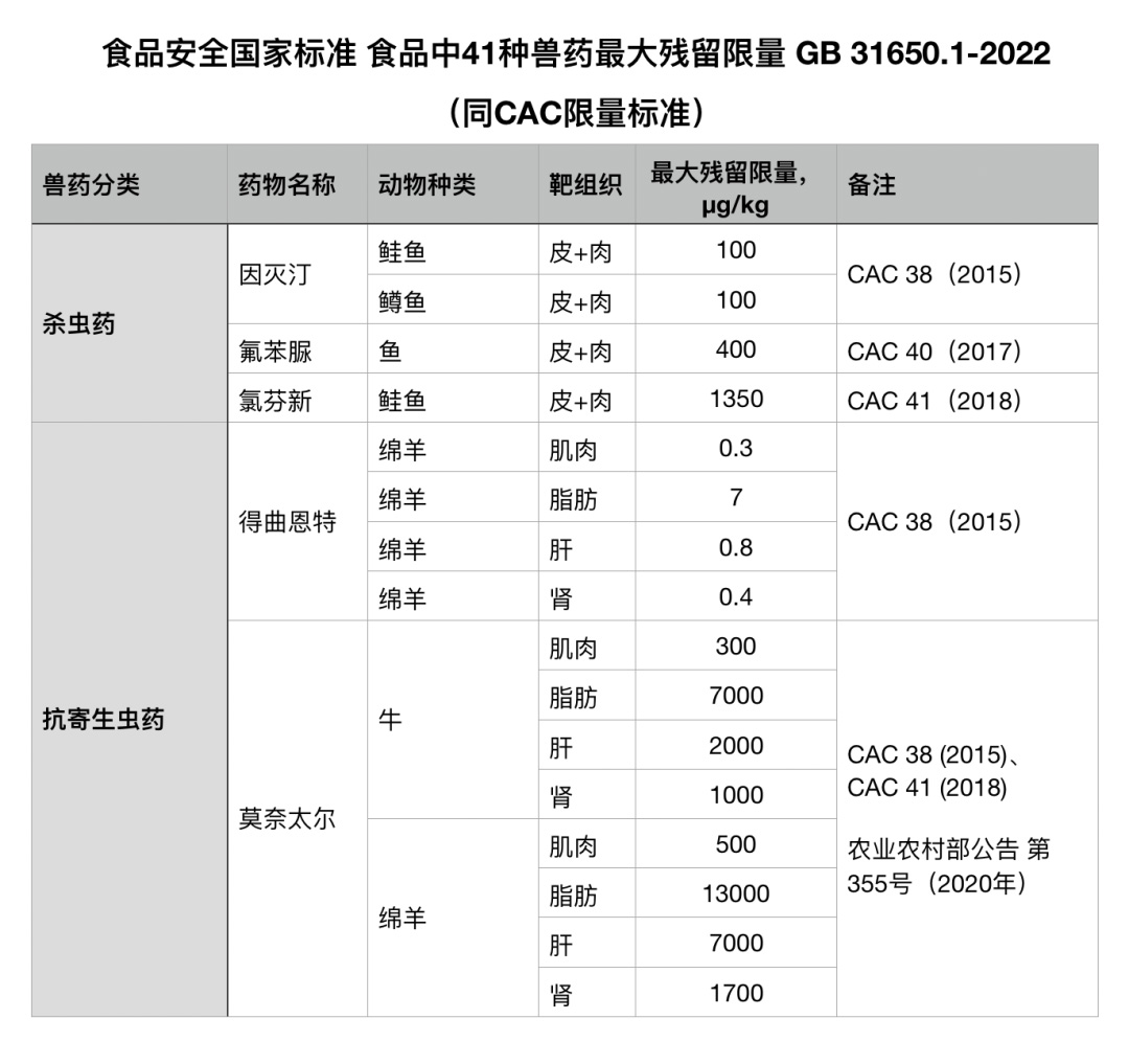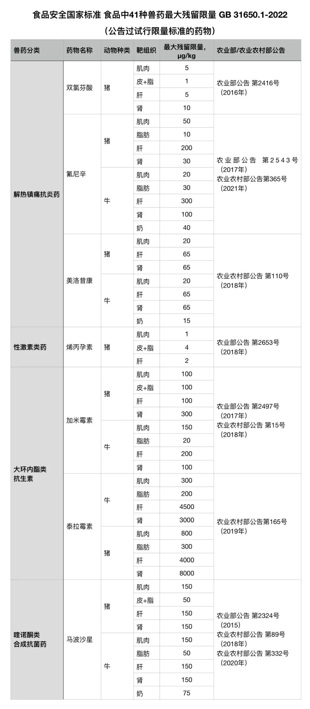《食品安全國家標(biāo)準(zhǔn) 食品中41種獸藥最大殘留限量》(GB 31650.1-2022),41種在動(dòng)物性食品中增修訂限量標(biāo)準(zhǔn)的藥物,主要為以下四種情況: