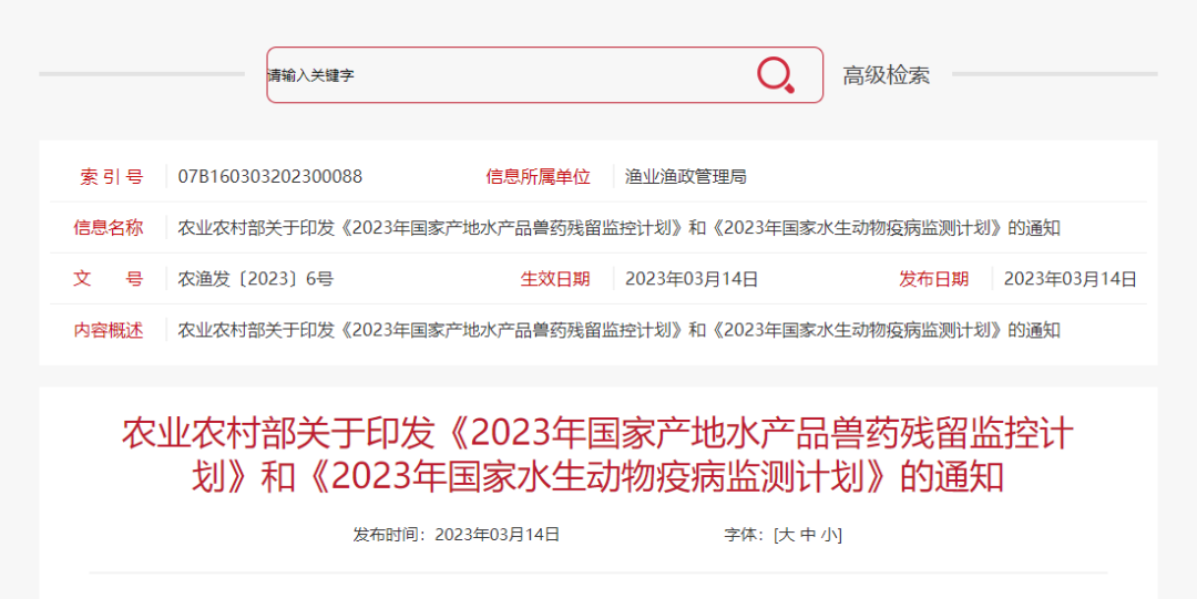 各省、自治區(qū)、直轄市農(nóng)業(yè)農(nóng)村(農(nóng)牧)、漁業(yè)廳(局、委),計劃單列市漁業(yè)主管局,新疆生產(chǎn)建設(shè)兵團(tuán)農(nóng)業(yè)農(nóng)村局,各有關(guān)單位: 為提升養(yǎng)殖水產(chǎn)品質(zhì)量安全和生物安全水平,保障水產(chǎn)品安全有效供給,推進(jìn)水產(chǎn)養(yǎng)殖業(yè)綠色高質(zhì)量發(fā)展,根據(jù)《中華人民共和國漁業(yè)法》、《中華人民共和國農(nóng)產(chǎn)品質(zhì)量安全法》、《中華人民共和國動物防疫法》、《獸藥管理條例》等法律法規(guī),我部制定了《2023年國家產(chǎn)地水產(chǎn)品獸藥殘留監(jiān)控計劃》、《2023年國家水生動物疫病監(jiān)測計劃》。現(xiàn)印發(fā)給你們,請認(rèn)真組織實(shí)施執(zhí)行。有關(guān)要求通知如下。 (一)農(nóng)業(yè)農(nóng)村部漁業(yè)漁政管理局負(fù)責(zé)監(jiān)督管理水產(chǎn)養(yǎng)殖用獸藥及其他投入品的使用,負(fù)責(zé)提出和組織國家產(chǎn)地水產(chǎn)品獸藥殘留監(jiān)控計劃和國家水生動物疫病監(jiān)測計劃,發(fā)布監(jiān)控(測)結(jié)果,組織分析研判養(yǎng)殖水產(chǎn)品的質(zhì)量安全和養(yǎng)殖水生生物的生物安全形勢。 (二)中國水產(chǎn)科學(xué)研究院(以下稱“水科院”)負(fù)責(zé)具體組織實(shí)施國家產(chǎn)地水產(chǎn)品獸藥殘留監(jiān)控計劃,對各地監(jiān)控工作給予技術(shù)指導(dǎo)。中國水產(chǎn)科學(xué)研究院質(zhì)量與標(biāo)準(zhǔn)研究中心(以下稱“水科院質(zhì)標(biāo)中心”)負(fù)責(zé)國家產(chǎn)地水產(chǎn)品獸藥殘留監(jiān)控計劃抽檢結(jié)果的匯總、分析和會商等工作。國家水產(chǎn)品質(zhì)量監(jiān)督檢驗(yàn)中心等水產(chǎn)品質(zhì)檢機(jī)構(gòu)(以下稱“質(zhì)檢機(jī)構(gòu)”)負(fù)責(zé)協(xié)助開展國家產(chǎn)地水產(chǎn)品獸藥殘留監(jiān)控計劃的抽樣、檢測和結(jié)果報送等工作。 (三)全國水產(chǎn)技術(shù)推廣總站負(fù)責(zé)具體組織實(shí)施國家水生動物疫病監(jiān)測計劃,組織各省級水生動物疫病預(yù)防控制(水產(chǎn)養(yǎng)殖病害防治、水產(chǎn)技術(shù)推廣)機(jī)構(gòu)(以下稱“省級水生動物疫控機(jī)構(gòu)”),協(xié)調(diào)水生動物疫病參考實(shí)驗(yàn)室和相關(guān)檢測機(jī)構(gòu),開展全國水生動物疫病監(jiān)測,指導(dǎo)各省份開展監(jiān)測、凈化與評估工作;組織首席專家開展監(jiān)測信息的分析評估、疫病形勢會商和疫情預(yù)警工作;及時完成監(jiān)測結(jié)果匯總、分析和上報;發(fā)生突發(fā)水生動物疫情時,及時組織開展緊急監(jiān)測診斷處置工作。負(fù)責(zé)國家產(chǎn)地水產(chǎn)品獸藥殘留監(jiān)控計劃中水產(chǎn)養(yǎng)殖動物主要病原菌耐藥性監(jiān)測的具體組織實(shí)施工作,負(fù)責(zé)組織各級水產(chǎn)技術(shù)推廣機(jī)構(gòu)和相關(guān)專家開展水產(chǎn)養(yǎng)殖用藥減量行動和規(guī)范用藥科普下鄉(xiāng)活動,及時調(diào)度各地工作情況和總結(jié)。 (四)省級主管部門負(fù)責(zé)組織實(shí)施本轄區(qū)內(nèi)國家產(chǎn)地水產(chǎn)品獸藥殘留監(jiān)控計劃和國家水生動物疫病監(jiān)測計劃,加強(qiáng)產(chǎn)地水產(chǎn)品獸藥殘留管控,做好水生動物疫病防控,制定和組織實(shí)施省級產(chǎn)地水產(chǎn)品獸藥殘留監(jiān)控(監(jiān)督抽查)計劃和水生動物疫病監(jiān)測計劃,對轄區(qū)內(nèi)各級主管部門開展的產(chǎn)地水產(chǎn)品獸藥殘留監(jiān)控和水生動物疫病監(jiān)測等工作進(jìn)行指導(dǎo)。 (一)加強(qiáng)組織領(lǐng)導(dǎo)。加強(qiáng)養(yǎng)殖水產(chǎn)品質(zhì)量安全監(jiān)管和養(yǎng)殖水生生物疫病防控是保障水產(chǎn)品安全有效供給的基礎(chǔ)。地方各級農(nóng)業(yè)農(nóng)村(漁業(yè))主管部門務(wù)必要高度重視這兩項工作,強(qiáng)化組織領(lǐng)導(dǎo),細(xì)化職責(zé)分工,壓實(shí)各級責(zé)任,加強(qiáng)部門聯(lián)動,不折不扣地完成國家產(chǎn)地水產(chǎn)品獸藥殘留監(jiān)控計劃和國家水生動物疫病監(jiān)測計劃的各項工作任務(wù)。 (二)強(qiáng)化經(jīng)費(fèi)保障。依據(jù)《中華人民共和國農(nóng)產(chǎn)品質(zhì)量安全法》、《中華人民共和國動物防疫法》等法律,各地農(nóng)業(yè)農(nóng)村(漁業(yè))部門要將產(chǎn)地水產(chǎn)品獸藥殘留監(jiān)控和水生動物疫病監(jiān)測工作納入本級財政預(yù)算,落實(shí)監(jiān)管責(zé)任,確保工作取得實(shí)效。國家產(chǎn)地水產(chǎn)品獸藥殘留監(jiān)控計劃和國家水生動物疫病監(jiān)測計劃中國家負(fù)責(zé)部分所需經(jīng)費(fèi)納入中央財政預(yù)算。 (三)推進(jìn)源頭治理。地方各級農(nóng)業(yè)農(nóng)村(漁業(yè))主管部門要持續(xù)加強(qiáng)水產(chǎn)品質(zhì)量安全和水生生物生物安全的源頭管控,結(jié)合水產(chǎn)綠色健康養(yǎng)殖技術(shù)推廣“五大行動”的實(shí)施,推廣生態(tài)健康養(yǎng)殖技術(shù)模式,升級基礎(chǔ)設(shè)施裝備,配套水產(chǎn)良種和防病技術(shù),規(guī)范日常管理和獸藥使用,持續(xù)提升養(yǎng)殖主體的質(zhì)量安全和疫病防控意識。相關(guān)省份要開展海參和牛蛙養(yǎng)殖