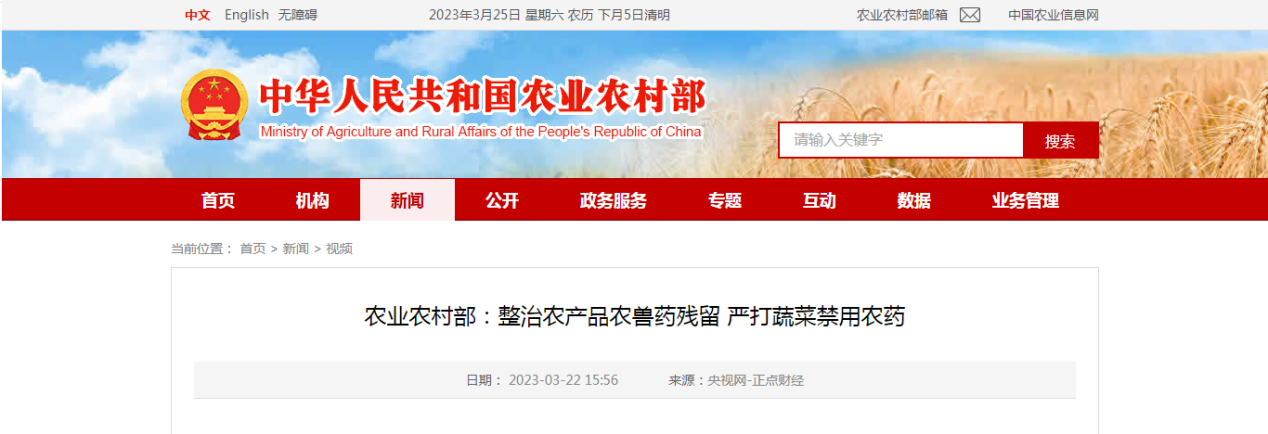 3月21日, 農(nóng)業(yè)農(nóng)村部 ”2023年全國農(nóng)產(chǎn)品質(zhì)量安全監(jiān)管工作會(huì)議“在云南省昆明市召開。會(huì)議表示,針對(duì)一些農(nóng)產(chǎn)品農(nóng)獸藥殘留方面的突出問題將在嚴(yán)打蔬菜禁用農(nóng)藥源頭上下功夫。據(jù)介紹,2022年全國農(nóng)產(chǎn)品監(jiān)測合格率達(dá)到97.6%,農(nóng)產(chǎn)品質(zhì)量安全形勢持續(xù)向好。但是,農(nóng)產(chǎn)品質(zhì)量安全隱患依然不少,禁用藥物的違法使用雖有下降但并未杜絕,防止常規(guī)農(nóng)藥超標(biāo)成為新時(shí)期的重要任務(wù)。
