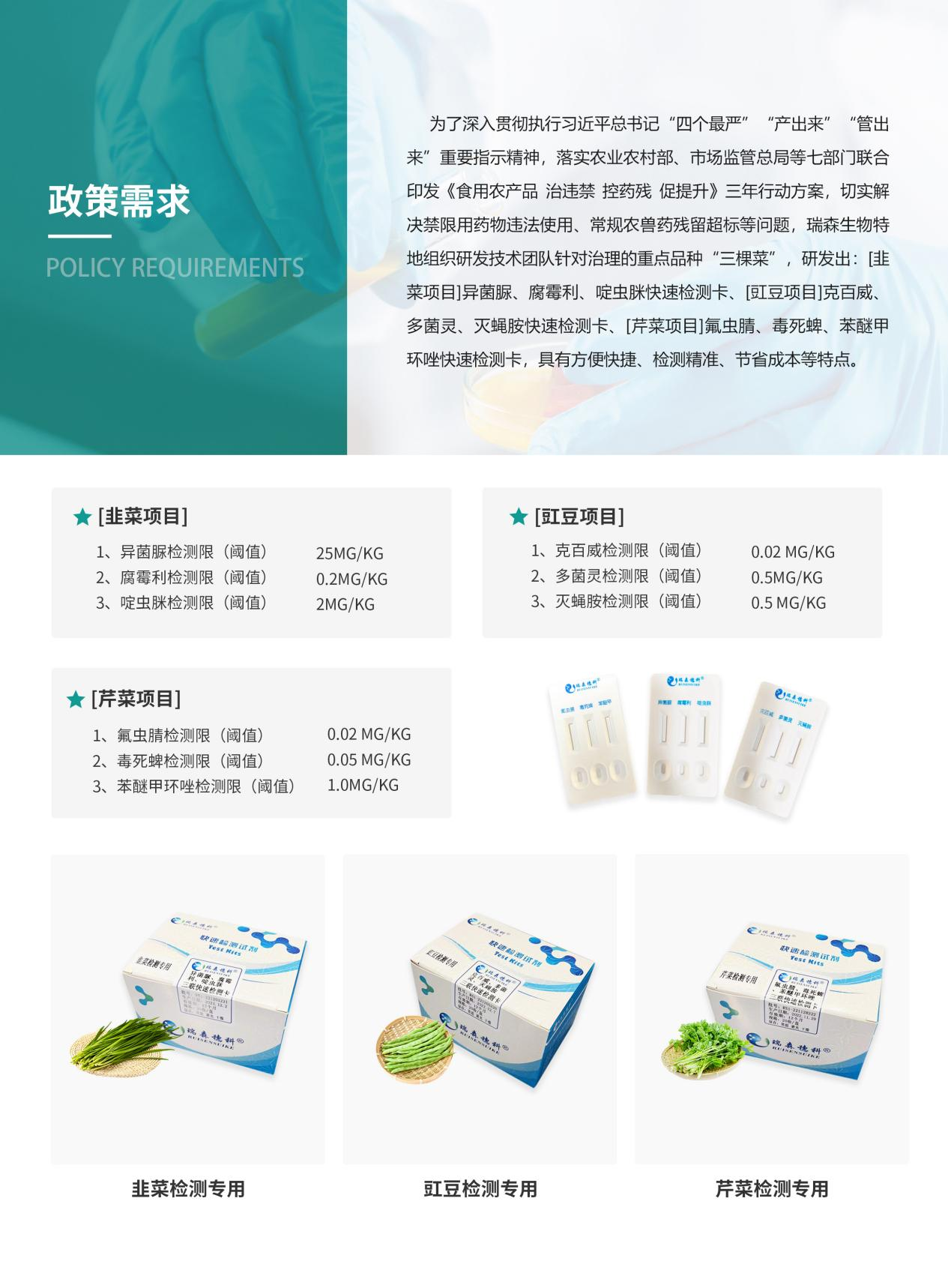 瑞森生物認(rèn)真學(xué)習(xí)和貫徹農(nóng)業(yè)農(nóng)村部2023年全國農(nóng)產(chǎn)品質(zhì)量安全監(jiān)管工作會(huì)議精神,積極擁護(hù)和響應(yīng)《中華人民共和國食品安全法》。早在2021年國家農(nóng)業(yè)農(nóng)村部發(fā)布了《食用農(nóng)產(chǎn)品“治違禁 控藥殘 促提升”三年行動(dòng)方案》的通知后,瑞森生物就積極擁護(hù)和響應(yīng)文件精神,并針對(duì)《方案》中提到的需要重點(diǎn)治理的11種農(nóng)產(chǎn)品:“三棵菜”、“一枚蛋”、“一只雞”、”肉牛肉羊“、“四條魚”,推出了相關(guān)的新品應(yīng)對(duì)方案,包括”農(nóng)藥殘留膠體金多聯(lián)檢測產(chǎn)品系列“、”禽蛋藥殘專項(xiàng)檢測解決方案“、”熒光定量快速檢測產(chǎn)品“等相關(guān)技術(shù)領(lǐng)先的新型檢測產(chǎn)品。有效解決了國家食用農(nóng)產(chǎn)品存在的安全隱患問題,充分保障了老百姓”菜籃子“上的安全。