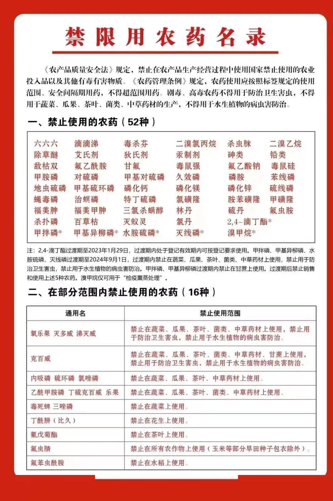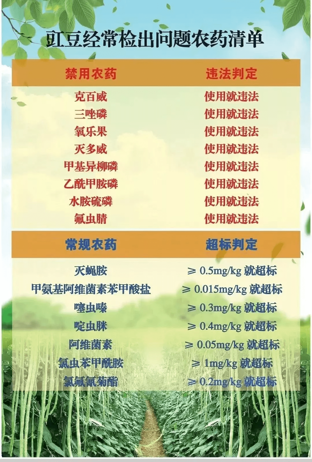 豇豆,別名“長豆角”、“長豆子”、“豆角”。近年來,豇豆由于病蟲害多發(fā)重發(fā)、用藥頻繁,花果同期,采摘間隔短,加之豇豆以小農(nóng)戶分散種值為主,連續(xù)多年監(jiān)測合格率偏低,禁用農(nóng)藥檢出和常規(guī)農(nóng)藥殘留超標(biāo)時(shí)有發(fā)生。為保障“菜籃子”產(chǎn)品質(zhì)量安全,農(nóng)業(yè)農(nóng)村部發(fā)布《食用農(nóng)產(chǎn)品“治違禁 控藥殘 促提升”三年行動方案》內(nèi)容中提到,把豇豆列入重點(diǎn)整治品種,在全國開展豇豆農(nóng)藥殘留突出問題攻堅(jiān)治理。 另外,《農(nóng)產(chǎn)品質(zhì)量安全法》規(guī)定,禁止在農(nóng)產(chǎn)品生產(chǎn)經(jīng)營過程中使用國家禁止使用的農(nóng)業(yè)投入品以及其他有毒有害物質(zhì)?!掇r(nóng)藥管理?xiàng)l例》規(guī)定,農(nóng)藥使用應(yīng)按照標(biāo)簽規(guī)定的使用范圍、安全間隔期用藥,不得超范圍用藥。劇毒、高毒農(nóng)藥不得用于防治衛(wèi)生害蟲,不得用于蔬菜、瓜果、茶葉、菌類、中草藥材的生產(chǎn),不得用于水生植物的病蟲害防治。一、農(nóng)產(chǎn)品禁限用農(nóng)藥名錄二、豇豆經(jīng)常檢出問題農(nóng)藥清單