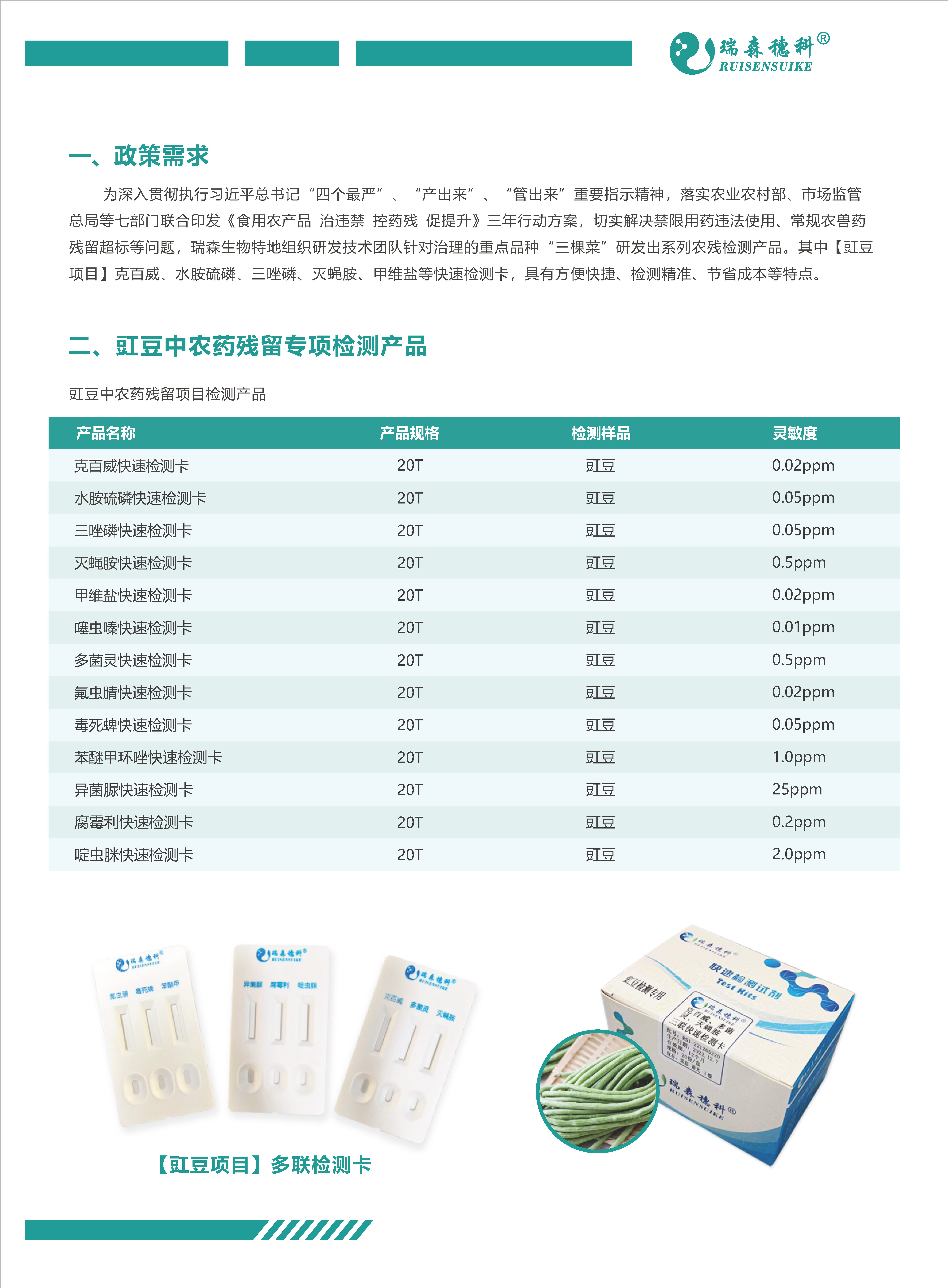 瑞森生物認(rèn)真學(xué)習(xí)和貫徹國家《農(nóng)產(chǎn)品質(zhì)量安全法》,積極擁護(hù)和響應(yīng)農(nóng)業(yè)農(nóng)村部《食用農(nóng)產(chǎn)品“治違禁 控藥殘 促提升”三年行動方案》文件精神。針對《方案》中提到的需要重點(diǎn)治理的“豇豆”農(nóng)產(chǎn)品,瑞森生物推出了“豇豆藥殘專項(xiàng)檢測解決方案”,有效解決了豇豆中農(nóng)藥殘留的相關(guān)問題。