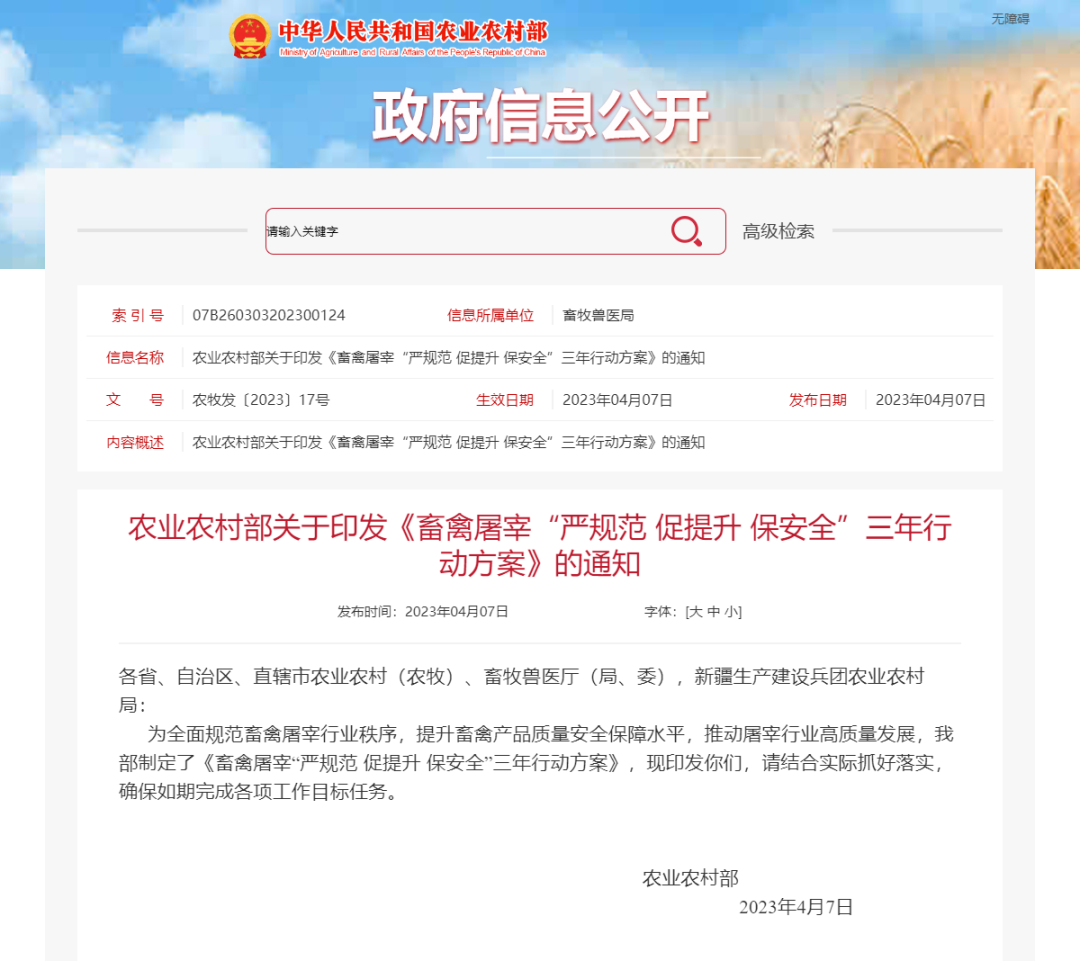 為貫徹落實(shí)《中華人民共和國(guó)畜牧法》、《中華人民共和國(guó)動(dòng)物防疫法》、《中華人民共和國(guó)農(nóng)產(chǎn)品質(zhì)量安全法》和《生豬屠宰管理?xiàng)l例》,以及《國(guó)務(wù)院辦公廳關(guān)于促進(jìn)畜牧業(yè)高質(zhì)量發(fā)展的意見(jiàn)》有關(guān)要求,全面規(guī)范畜禽屠宰行業(yè)秩序,提升畜禽產(chǎn)品質(zhì)量安全保障水平,推動(dòng)屠宰行業(yè)高質(zhì)量發(fā)展,我部決定實(shí)施畜禽屠宰“嚴(yán)規(guī)范 促提升 保安全”三年行動(dòng)。具體方案如下。通過(guò)實(shí)施三年行動(dòng),到2025年,全國(guó)畜禽屠宰布局結(jié)構(gòu)進(jìn)一步優(yōu)化,屠宰產(chǎn)能向養(yǎng)殖主產(chǎn)區(qū)集聚,與養(yǎng)殖產(chǎn)能匹配度明顯提高;落后產(chǎn)能有序壓減,牛羊禽集中屠宰扎實(shí)推進(jìn),畜禽屠宰產(chǎn)能利用率和行業(yè)集中度穩(wěn)步提高,畜禽屠宰規(guī)范化機(jī)械化智能化水平明顯提升;生豬屠宰企業(yè)全部實(shí)施屠宰質(zhì)量管理規(guī)范(以下簡(jiǎn)稱(chēng)“屠宰GMP”),部級(jí)生豬屠宰標(biāo)準(zhǔn)化建設(shè)示范單位達(dá)200家以上,其他畜禽屠宰標(biāo)準(zhǔn)化創(chuàng)建穩(wěn)步開(kāi)展;畜禽屠宰法規(guī)標(biāo)準(zhǔn)體系進(jìn)一步完善,監(jiān)管能力和水平進(jìn)一步提升,屠宰環(huán)節(jié)畜禽產(chǎn)品質(zhì)量安全得到有效保障。(一)加強(qiáng)法規(guī)制度建設(shè),推動(dòng)產(chǎn)業(yè)結(jié)構(gòu)優(yōu)化升級(jí)1.健全完善法規(guī)標(biāo)準(zhǔn)體系。出臺(tái)《生豬定點(diǎn)屠宰廠(場(chǎng))設(shè)置審查辦法》、《生豬屠宰質(zhì)量管理規(guī)范》等管理制度,健全畜禽屠宰標(biāo)準(zhǔn)體系,全面規(guī)范畜禽屠宰行為和秩序。各地要做好《中華人民共和國(guó)畜牧法》地方配套立法工作,2025年底前完成畜禽屠宰管理地方性法規(guī)或政府規(guī)章的制修訂。在邊遠(yuǎn)和交通不便的農(nóng)村地區(qū)確需設(shè)置小型屠宰場(chǎng)點(diǎn)的,各地要制定具體管理辦法,加強(qiáng)場(chǎng)點(diǎn)設(shè)置和質(zhì)量安全管理。2.科學(xué)規(guī)劃行業(yè)發(fā)展。各地要按照科學(xué)布局、集中屠宰、有利流通、方便群眾的原則,科學(xué)制定畜禽屠宰行業(yè)發(fā)展規(guī)劃,合理設(shè)定轄區(qū)屠宰行業(yè)發(fā)展目標(biāo),嚴(yán)格控制屠宰企業(yè)數(shù)量和產(chǎn)能,有序壓減落后產(chǎn)能,穩(wěn)步提高屠宰產(chǎn)能利用率和行業(yè)集中度;優(yōu)化企業(yè)布局,引導(dǎo)畜禽屠宰企業(yè)向養(yǎng)殖主產(chǎn)區(qū)轉(zhuǎn)移,促進(jìn)運(yùn)活畜禽向運(yùn)肉轉(zhuǎn)變,推進(jìn)畜禽屠宰產(chǎn)業(yè)轉(zhuǎn)型升級(jí)。原則上生豬屠宰行業(yè)發(fā)展規(guī)劃應(yīng)于2023年底前出臺(tái),其他畜禽屠宰行業(yè)發(fā)展規(guī)劃應(yīng)于2025年底前出臺(tái)。(二)強(qiáng)化監(jiān)督管理,保障畜禽產(chǎn)品質(zhì)量安全3.嚴(yán)格企業(yè)設(shè)立管理。畜禽屠宰企業(yè)的設(shè)立應(yīng)當(dāng)符合本省份畜禽屠宰行業(yè)發(fā)展規(guī)劃和國(guó)家產(chǎn)業(yè)結(jié)構(gòu)調(diào)整政策,具備法定設(shè)立條件。實(shí)行定點(diǎn)屠宰管理的,要依法依規(guī)嚴(yán)格審批。加快淘汰橋式劈半鋸、敞式生豬燙毛機(jī)以及手工屠宰等落后生產(chǎn)工藝。不符合條件的畜禽屠宰企業(yè),責(zé)令停業(yè)整頓,逾期仍未達(dá)到法定條件的,依法予以關(guān)閉,實(shí)行定點(diǎn)屠宰的要吊銷(xiāo)定點(diǎn)屠宰證書(shū)。各地要及時(shí)向社會(huì)公布合法合規(guī)企業(yè)名單,對(duì)于依法設(shè)立的屠宰加工場(chǎng)所,動(dòng)物衛(wèi)生監(jiān)督機(jī)構(gòu)方可派駐(出)官方獸醫(yī)實(shí)施檢疫。4.加強(qiáng)過(guò)程監(jiān)管。各地要加強(qiáng)對(duì)畜禽屠宰活動(dòng)的日常監(jiān)督檢查,建立監(jiān)督檢查專(zhuān)家?guī)?,完善“雙隨機(jī)”抽查機(jī)制,實(shí)施屠宰企業(yè)信用檔案管理,規(guī)范事中事后監(jiān)管。加大畜禽屠宰質(zhì)量安全風(fēng)險(xiǎn)監(jiān)測(cè)力度,加強(qiáng)風(fēng)險(xiǎn)監(jiān)測(cè)能力建設(shè)和經(jīng)費(fèi)保障。強(qiáng)化風(fēng)險(xiǎn)監(jiān)測(cè)結(jié)果應(yīng)用,做好追溯核查,有針對(duì)性地開(kāi)展監(jiān)督檢查。加快推動(dòng)牛羊禽集中屠宰、集中檢疫,落實(shí)肉品品質(zhì)檢驗(yàn)等質(zhì)量安全管理制度。抓好畜禽屠宰標(biāo)準(zhǔn)落實(shí)工作,全面推行生豬屠宰GMP,鼓勵(lì)各地對(duì)其他畜禽實(shí)施屠宰GMP。5.嚴(yán)厲打擊違法違規(guī)行為。對(duì)未按規(guī)定建立質(zhì)量安全管理制度,出廠銷(xiāo)售未經(jīng)檢驗(yàn)、檢疫或者經(jīng)檢驗(yàn)、檢疫不合格的畜禽產(chǎn)品的,各地要依法依規(guī)嚴(yán)肅查處。要加強(qiáng)畜禽屠宰專(zhuān)項(xiàng)整治,保持對(duì)私屠濫宰、注水或注入其他物質(zhì)、屠宰病死畜禽等違法行為的高壓嚴(yán)打態(tài)勢(shì)。強(qiáng)化行政執(zhí)法與刑事司法銜接,及時(shí)向公安機(jī)關(guān)移送涉嫌犯罪案件,嚴(yán)懲重處違法犯罪行為。落實(shí)“處罰到人”要求,依法實(shí)施行業(yè)禁入。(三)壓實(shí)主