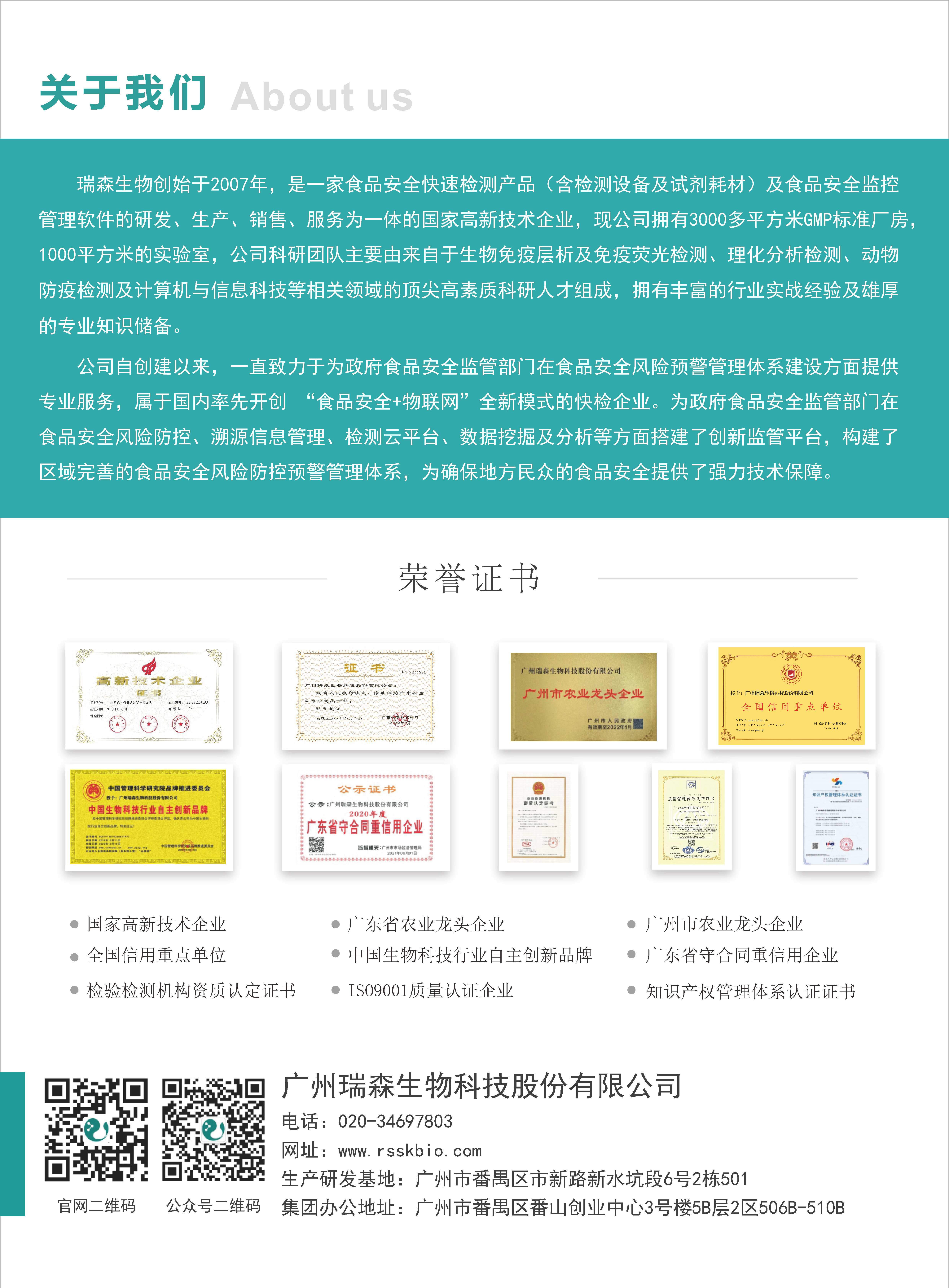 瑞森生物作為廣東省重點(diǎn)農(nóng)業(yè)龍頭企業(yè),一直致力于食品安全檢測(cè)行業(yè),至今已深耕十六年之久。公司在食品安全檢測(cè)領(lǐng)域發(fā)揮了技術(shù)優(yōu)勢(shì),憑借精湛的技術(shù)為客戶(hù)提供優(yōu)質(zhì)、穩(wěn)定、可靠的產(chǎn)品,為國(guó)人食品安全保駕護(hù)航,也為推動(dòng)食品檢測(cè)行業(yè)高質(zhì)量發(fā)展貢獻(xiàn)了企業(yè)力量。公司屬?lài)?guó)家高新技術(shù)企業(yè),廣東省重點(diǎn)農(nóng)業(yè)龍頭企業(yè),廣州市農(nóng)業(yè)龍頭企業(yè),全國(guó)重點(diǎn)信用單位,廣東省守合同重信用企業(yè),中國(guó)生物科技行業(yè)自主創(chuàng)新品牌企業(yè),目前擁有國(guó)家專(zhuān)利29項(xiàng),國(guó)家軟件著作權(quán)18項(xiàng),高新技術(shù)產(chǎn)品15項(xiàng),技術(shù)項(xiàng)目研發(fā)5項(xiàng)。公司現(xiàn)擁有快速檢測(cè)試劑和設(shè)備上百種,核心產(chǎn)品通過(guò)農(nóng)業(yè)農(nóng)村部驗(yàn)證,可為監(jiān)管部門(mén)、農(nóng)牧企業(yè)、經(jīng)銷(xiāo)商提供專(zhuān)業(yè)、全面的檢測(cè)產(chǎn)品和服務(wù)。來(lái)源:國(guó)家農(nóng)業(yè)農(nóng)村部免責(zé)聲明:文章、視頻、圖片等所有內(nèi)容,僅用于學(xué)習(xí)交流,若有侵權(quán)內(nèi)容及其他涉法內(nèi)容,請(qǐng)及時(shí)聯(lián)系刪除或修改。