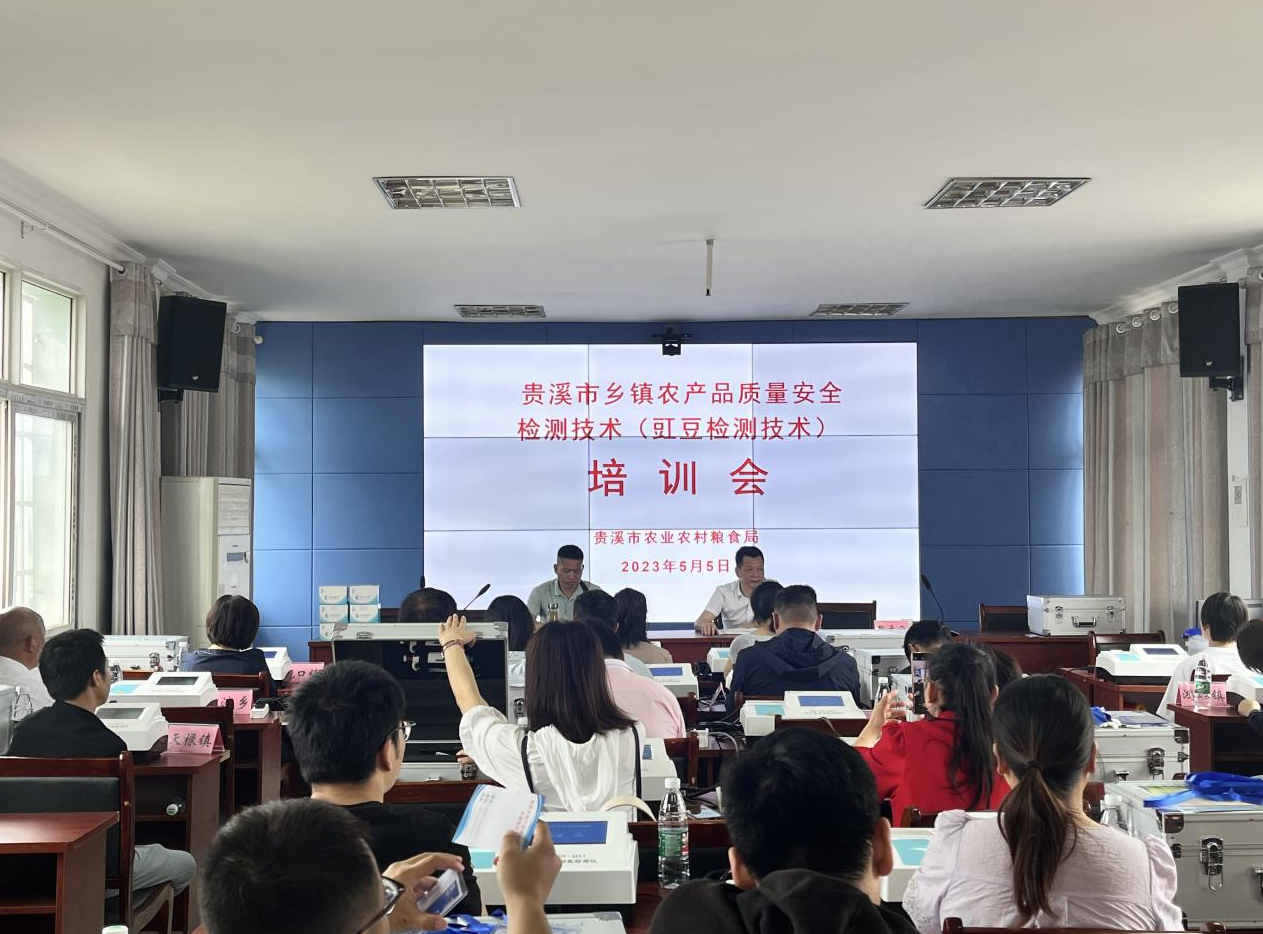 為不斷提升農(nóng)產(chǎn)品質(zhì)量安全監(jiān)管能力,鍛造農(nóng)產(chǎn)品質(zhì)量安全快速檢測過硬隊(duì)伍,保障農(nóng)產(chǎn)品質(zhì)量安全。江西省鷹潭市貴溪市農(nóng)業(yè)農(nóng)村糧食局于2023年5月5日舉辦了“貴溪市鄉(xiāng)鎮(zhèn)農(nóng)產(chǎn)品質(zhì)量安全檢測技術(shù)(豇豆檢測技術(shù))培訓(xùn)會”。貴溪市農(nóng)糧局分管領(lǐng)導(dǎo),貴溪市農(nóng)糧局市場信息與農(nóng)產(chǎn)品質(zhì)量安全監(jiān)管股領(lǐng)導(dǎo)及監(jiān)管股各干事、廣州瑞森生物科技股份有限公司相關(guān)領(lǐng)導(dǎo)和同事以及貴溪市18個(gè)涉農(nóng)鄉(xiāng)鎮(zhèn)及鷹潭市高新區(qū)白露街道辦事處共40余名檢測員參加本次培訓(xùn)會議。