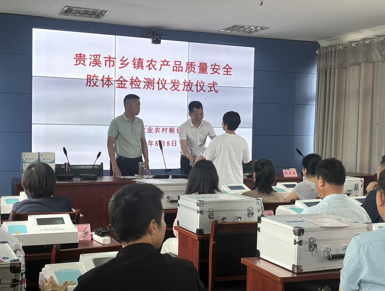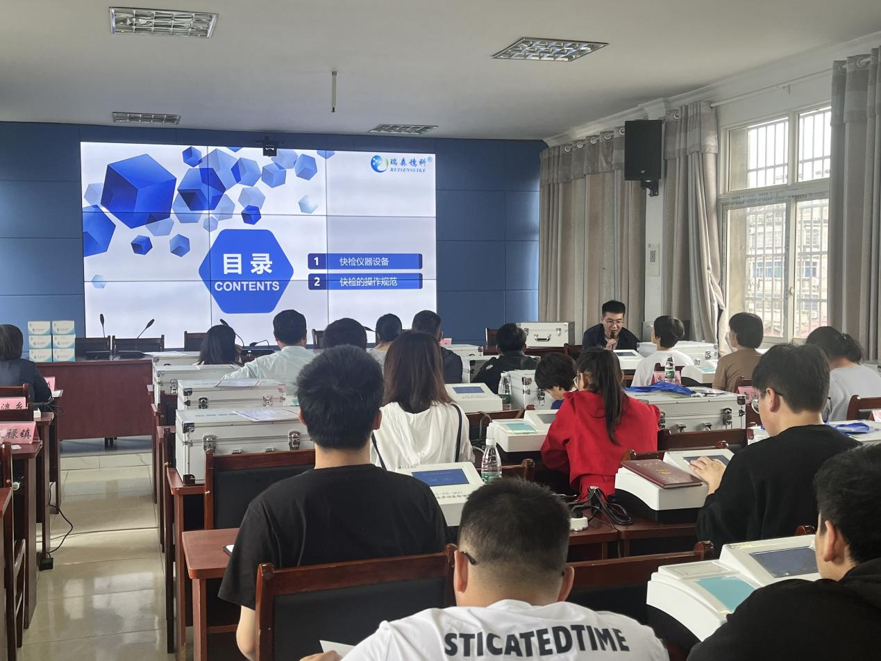 在培訓(xùn)會上,貴溪市農(nóng)糧局為全市18個(gè)鄉(xiāng)鎮(zhèn)統(tǒng)一配備膠體金、酶抑制多功能快速檢測儀,局分管領(lǐng)導(dǎo)熊天云就新設(shè)備使用、豇豆種植及檢測相關(guān)注意事項(xiàng)做了強(qiáng)調(diào),并要求大家堅(jiān)決貫徹落實(shí)新農(nóng)安法,嚴(yán)格按照部省共建有關(guān)要求開展農(nóng)安工作,確保及時(shí)有效發(fā)現(xiàn)并處置農(nóng)產(chǎn)品質(zhì)量安全風(fēng)險(xiǎn),確保膠體金免疫檢測任務(wù)全部按時(shí)完成。 瑞森生物技術(shù)人員在本次培訓(xùn)會上,通過現(xiàn)場操作示教的方式,為現(xiàn)場與會人員生動詳細(xì)的培訓(xùn)了膠體金快速檢測儀的操作使用方法、使用膠體金檢測卡對蔬菜農(nóng)藥殘留進(jìn)行快速檢測示范操作以及畜禽產(chǎn)品獸藥殘留檢測等相關(guān)內(nèi)容。并現(xiàn)場考核了各鄉(xiāng)鎮(zhèn)檢測人員對韭菜、空心菜、西葫蘆、豬肉、牛尿等常見農(nóng)產(chǎn)品的膠體金卡檢測操作能力。