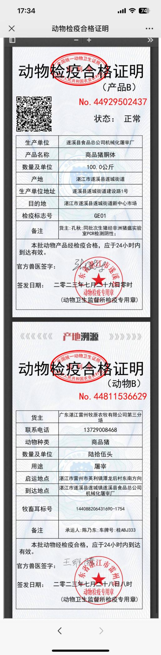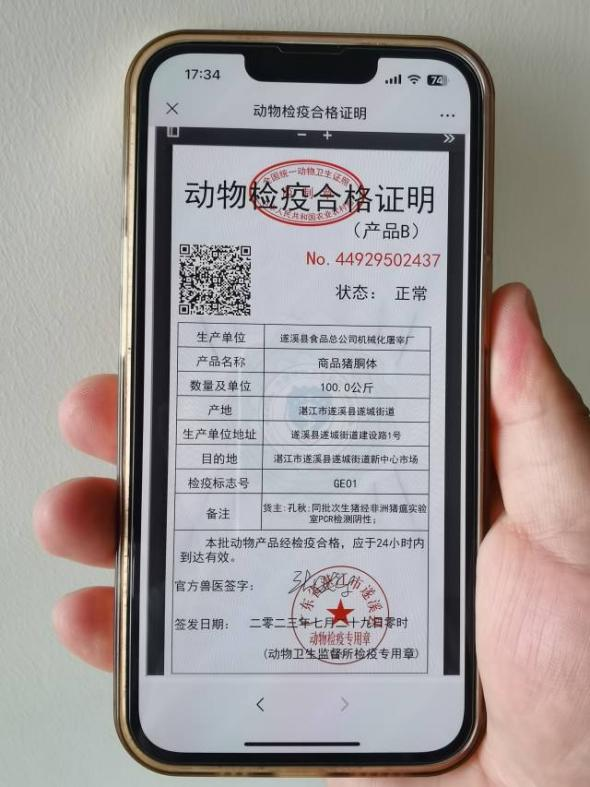 7月29日凌晨12點(diǎn)57分,遂溪縣食品總公司機(jī)械化屠宰廠的駐場(chǎng)官方獸醫(yī)開(kāi)出了湛江市首張動(dòng)物檢疫合格證明(產(chǎn)品B)電子證照,這是繼本月初無(wú)紙化出具動(dòng)物B證后,湛江市動(dòng)物檢疫工作在信息化建設(shè)上又一次新的突破;標(biāo)志著湛江市動(dòng)物檢疫合格證明無(wú)紙化改革工作、全鏈條檢疫追溯監(jiān)管體系建設(shè)又邁出了歷史性的一步,成為全省首個(gè)在產(chǎn)地檢疫與屠宰檢疫環(huán)節(jié)同時(shí)實(shí)現(xiàn)無(wú)紙化出證的地級(jí)市。